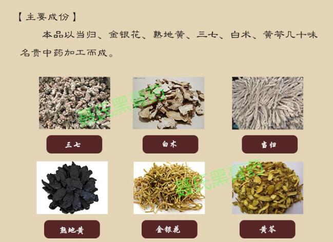 【主要成份】本品以當歸、金銀花、熟地黃、三七、白術(shù)、黃芩等幾十味名貴中藥加工而成。